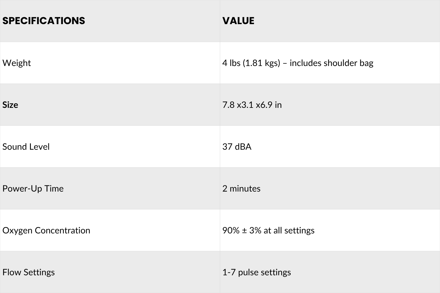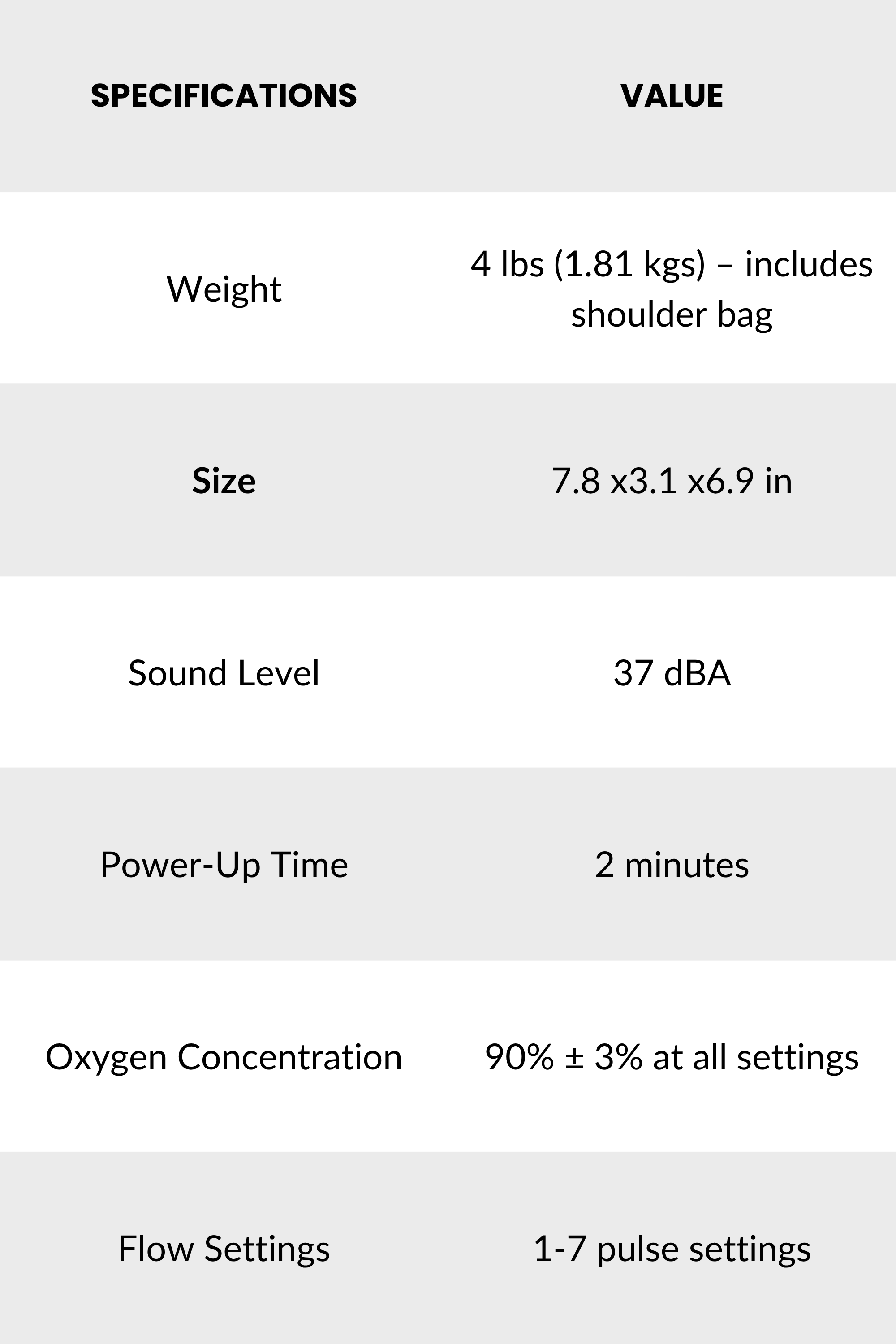Powered by a removable battery, the OxyQ7 delivers up to about 8 hours of runtime depending on the setting, with a fast recharge time of around 2 hours. It operates quietly at about 37 decibels and is FAA approved, making it a great option for everyday use and travel.
